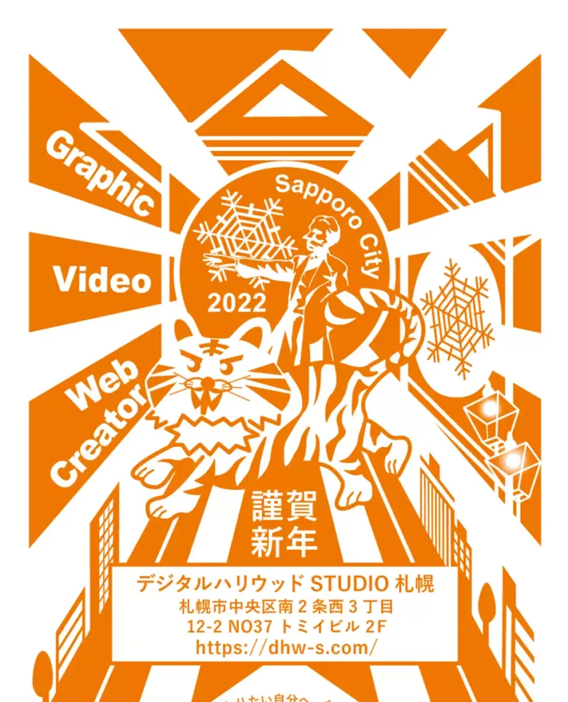 - 寅年の2022年。デジタルハリウッドのイメージカラーである「アクティブなオレンジ」とホワイトの2色のみのコントラストで札幌の景観イラストを織り交ぜながら構成しました。 制作した後で振り返ってみるとどちらかというと「札幌の街」が主役となってしまい、デジタルハリウッドらしさが欠けてしまったかと考えられたので、 見て直感的にデジタルハリウッドSTUDIO札幌校の特徴がわかるような要素を入れるべきでありました。
